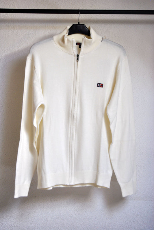 Cardigan Norway de color crema con logo bordado. Talla L.